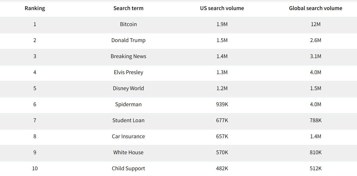 Как показано выше, другие популярные термины, следующие за Биткойном и Дональдом Трампом, включают последние новости, Элвиса Пресли и Мир Диснея. Ранее популярные запросы, такие как оружие, Чак Норрис, медицинская страховка и политика, даже не попали в первую десятку списка.