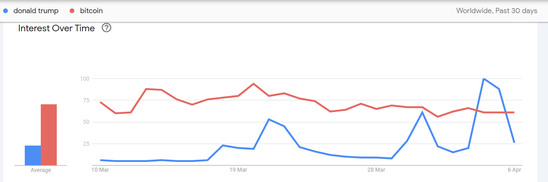 Согласно данным Google Trends, за последние 30 дней количество поисковых запросов Дональда Трампа в Google превысило биткойн всего за два дня — 4 и 5 апреля — когда появились сообщения о возможном аресте бывшего президента.