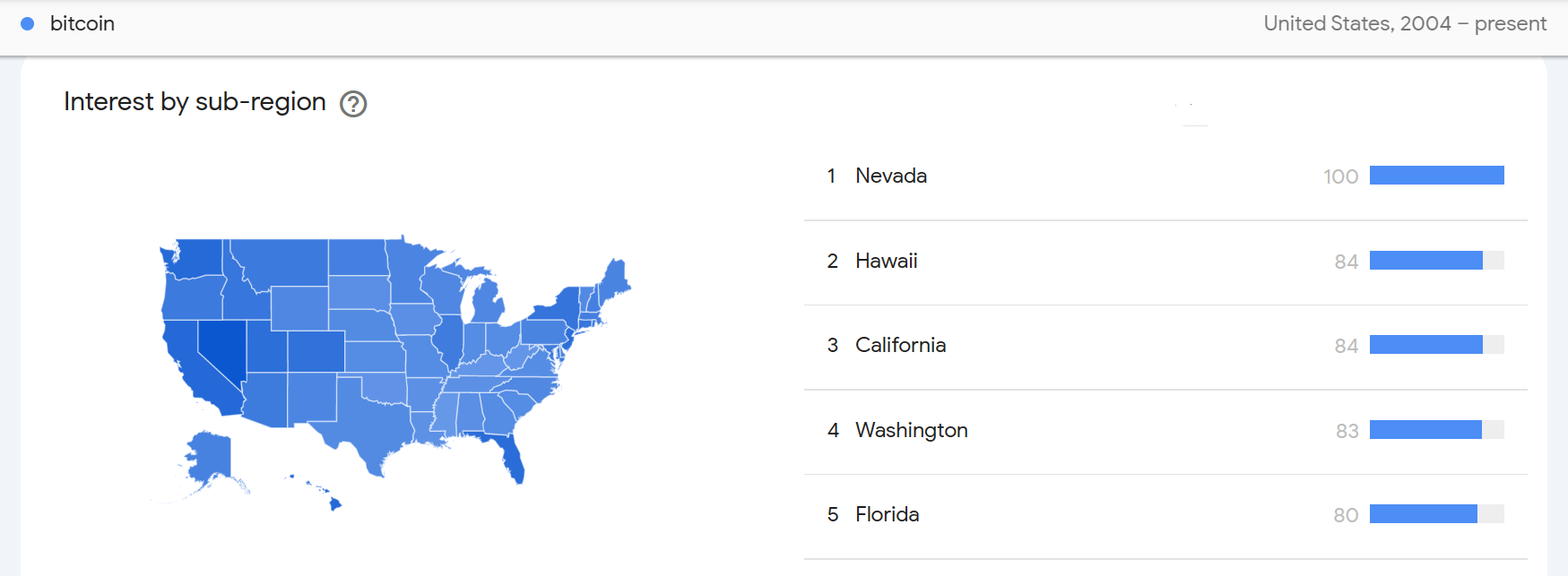 Сравнение по штатам показало, что Невада является штатом с наибольшим количеством поисковых запросов «Биткойн», за которым следуют Майами, Калифорния и Вашингтон.