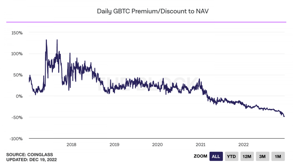 Grayscale Bitcoin Trust имеет тикер GBTC и является закрытым фондом с годовой комиссией в размере 2%. В настоящее время он торгуется со скидкой почти 50% по сравнению с ценой биткойнов.