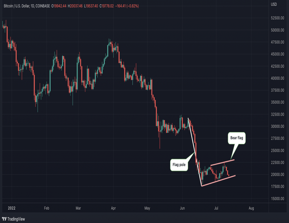 В случае биткоина корректирующее отскок от минимума 18 июня в размере 17 601 долл. США до пятничного максимума в 22 400 долл. США представляет собой флаг, а предыдущее снижение с 32 500 долл. США является флагштоком. Трендовые линии, соединяющие минимумы 18 и 3 июля, а также максимумы 26 июня и 8 июля, раскрывают флаг.
