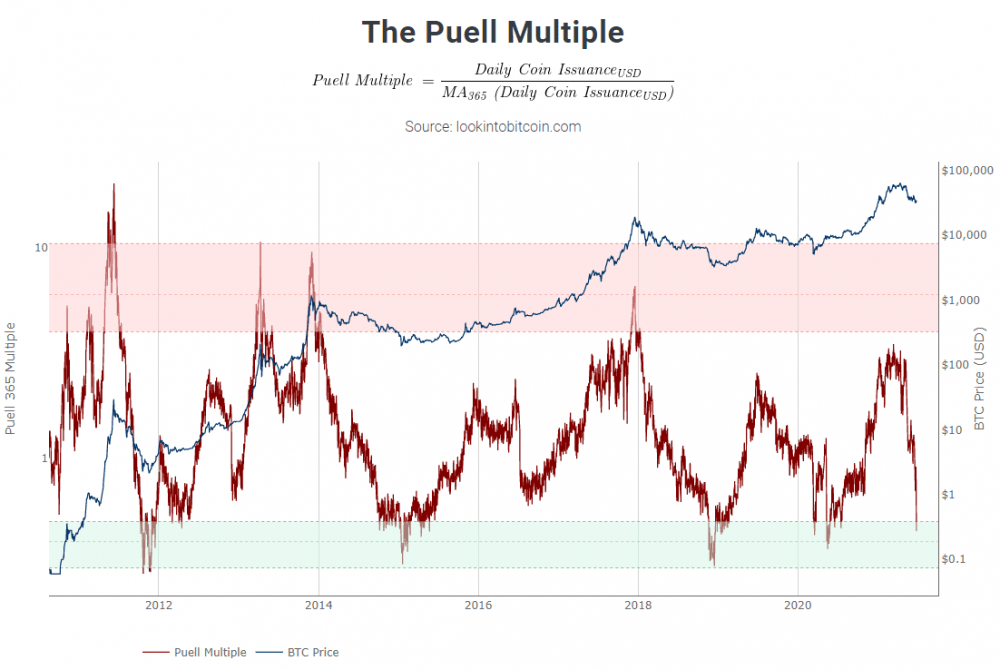 Как видно на графике выше, индикатор измеряет периоды, когда дневная стоимость выпущенного биткоина достигает исторических минимумов, представленных зеленым ящиком, или исторически высоких максимумов, которые видны, когда индикатор поднимается в красную коробку. Прошлые случаи, когда Puell Multiple указывал на хорошие возможности покупки, включают в себя середину 2018 года, когда цена BTC упала ниже 4000 долларов в разгар крипто-зимы и снова в марте 2020 года, когда цены рухнули в результате пандемии Covid-19. Он также предоставил трейдерам сигнал продажи в конце 2017 года, так как цена BTC превысила высоту этого цикла, а также на рынке биткоинов быков 2013 года.