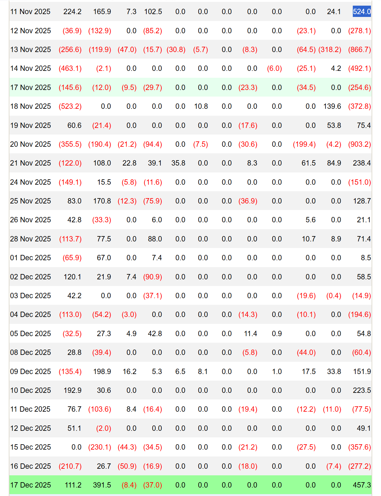 Последний раз притоки в спотовые биткоин‑ETF превышали $450 млн 11 ноября. Источник: Farside Investors.