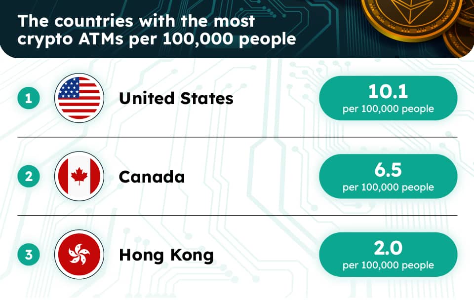 Соединенные Штаты остаются важным рынком для криптовалютных банкоматов. На США приходится 88% криптовалютных банкоматов всего мира. За первые 10 дней июля 2022 года в стране было введено в эксплуатацию около 641 крипто-банкомата. Канада занимает второе место по количеству крипто-банкоматов, что делает Северную Америку самым активным пользователем этой услуги. На третьем месте - Гонконг.
