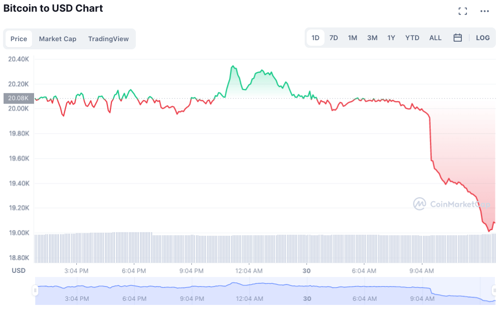 Согласно данным CoinMarketCap, на момент написания статьи биткойн переходит из рук в руки за 19 000 долларов, что на 5% меньше за последние 24 часа и на 40% за последние 30 дней, а общая рыночная капитализация составляет 382 миллиарда долларов.