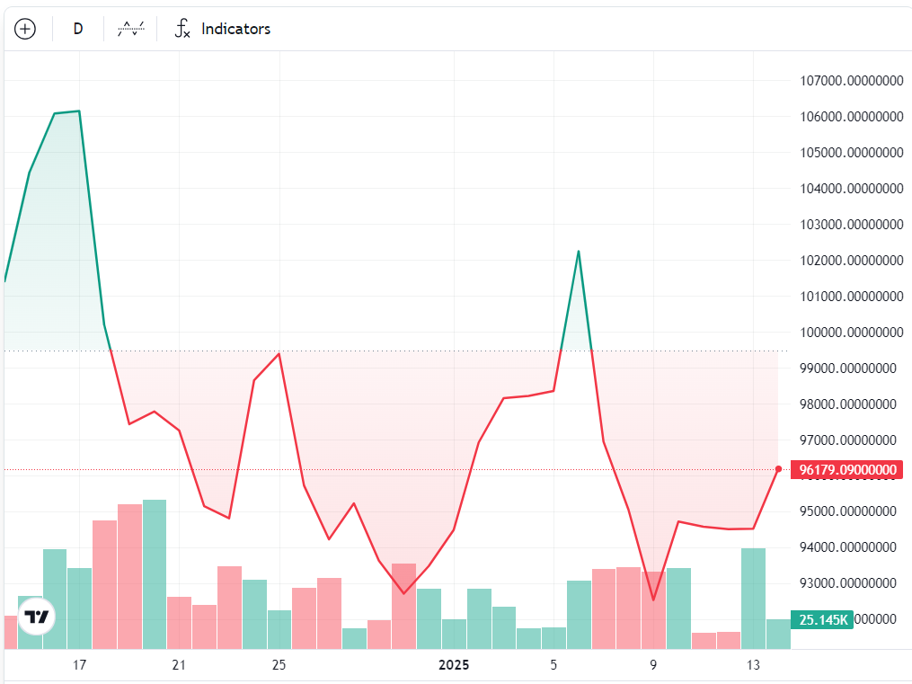 По банным TradingView биткоин торгуется ниже психологической отметки в 100 000 долларов с 7 января.
