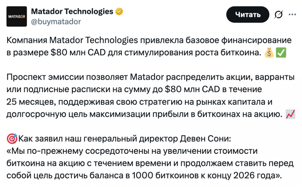 Комиссия по ценным бумагам провинции Онтарио разрешила компании Matador Technologies привлечь до 80 млн канадских долларов ($58,4 млн) путем продажи акций. Эти средства помогут компании достичь цели — к концу 2026 года владеть 1 000 биткоинов.