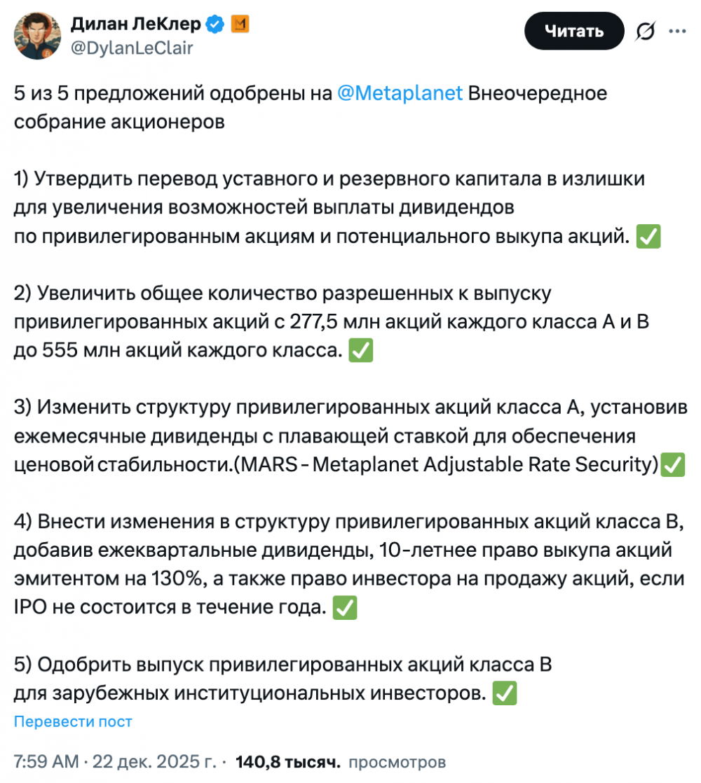 Дилан ЛеКлер, директор по биткоин‑стратегии компании, сообщил, что инвесторы одобрили пять предложений. Они в совокупности расширяют возможности Metaplanet: дают право выпускать привилегированные акции, вводить новые механизмы выплаты дивидендов и привлекать капитал зарубежных институциональных инвесторов.