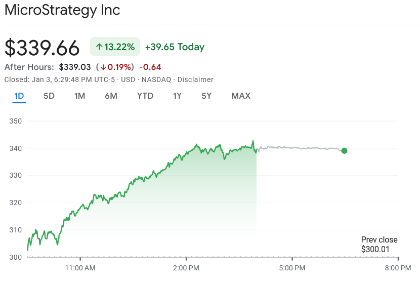 Изменение цены акций MSTR 3 января, включая время после закрытия торгов. Источник: Google Finance.