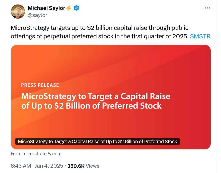 Предложение отделено от текущего плана MicroStrategy по привлечению $21 млрд в виде акционерного капитала и $21 млрд в виде инструментов с фиксированным доходом, стратегии, которую она в значительной степени реализовала в последние месяцы, чтобы подстегнуть свой всплеск покупок биткоинов с помощью старших конвертируемых облигаций и долговых обязательств.