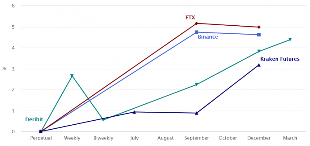 Квартальные фьючерсы на биткоин являются предпочтительными инструментами китов и арбитражных столов. Хотя это может показаться сложным для розничных трейдеров из-за даты их расчетов и разницы в цене от спотовых рынков, их самым значительным преимуществом является отсутствие колеблющейся ставки финансирования. Когда трейдеры выбирают бессрочные контракты (обратные свопы), обычно взимается комиссия каждые 8 часов, которая меняется в зависимости от того, какая сторона требует больше рычагов влияния. С другой стороны, контракты с фиксированным сроком действия обычно торгуются с премией от регулярных спотовых бирж.