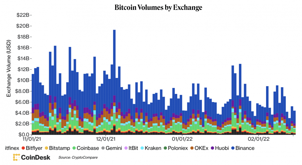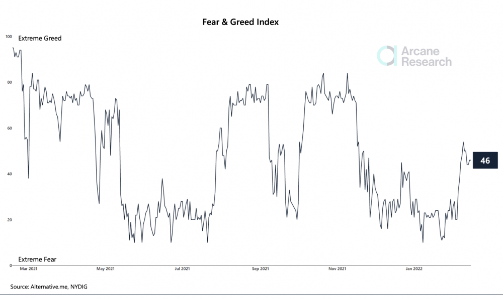 "В настоящее время трейдеры выглядят нерешительными, о чем свидетельствует рыночные настроения, колеблющиеся между страхом и жадностью и биткойнами в диапазоне между поддержкой в 42 000 долларов и сопротивлением в 46 000 долларов", - написал Arcane Research в отчете во вторник. "Если биткойн выйдет из этого диапазона, мы можем увидеть рост рыночной активности в будущем".