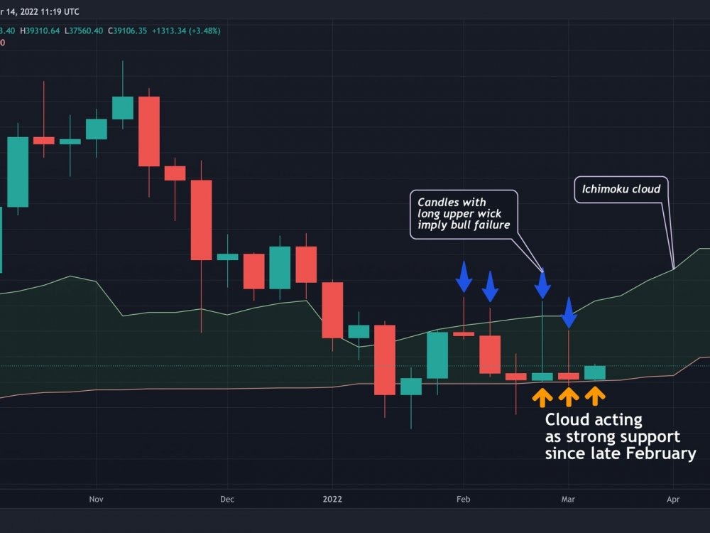 Популярное исследование технического анализа, облако Ichimoku, показало еженедельную поддержку биткоина около 37 600 долларов США, и ведущая криптовалюта за одну ночь упала до этого уровня, прежде чем стабилизироваться. При последней проверке биткойн вернулся к 39 000 долларов. Представленное изображение показывает, что облако последовательно выступало в качестве поддержки в последние недели. Таким образом, разбивка в начале сегодняшнего дня могла бы вызвать более существенное давление на продажи, основанное на графиках.