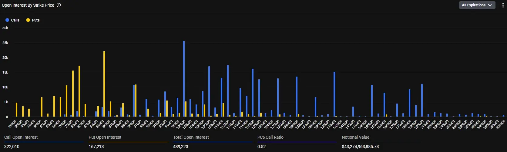 По данным Deribit, колл‑опционы (длинные контракты) сконцентрированы вокруг цен исполнения $100 000 и $120 000, а пут‑опционы (короткие контракты) — вокруг $85 000.