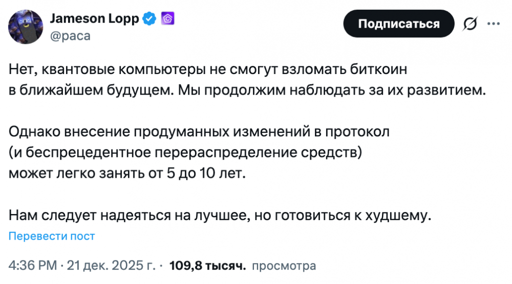 Лопп согласился с Адамом Бэком, генеральным директором компании Blockstream, занимающейся криптоинфраструктурой: в ближайшее время квантовые компьютеры не представляют угрозы для биткоина. В своем сообщении в X Лопп отметил: