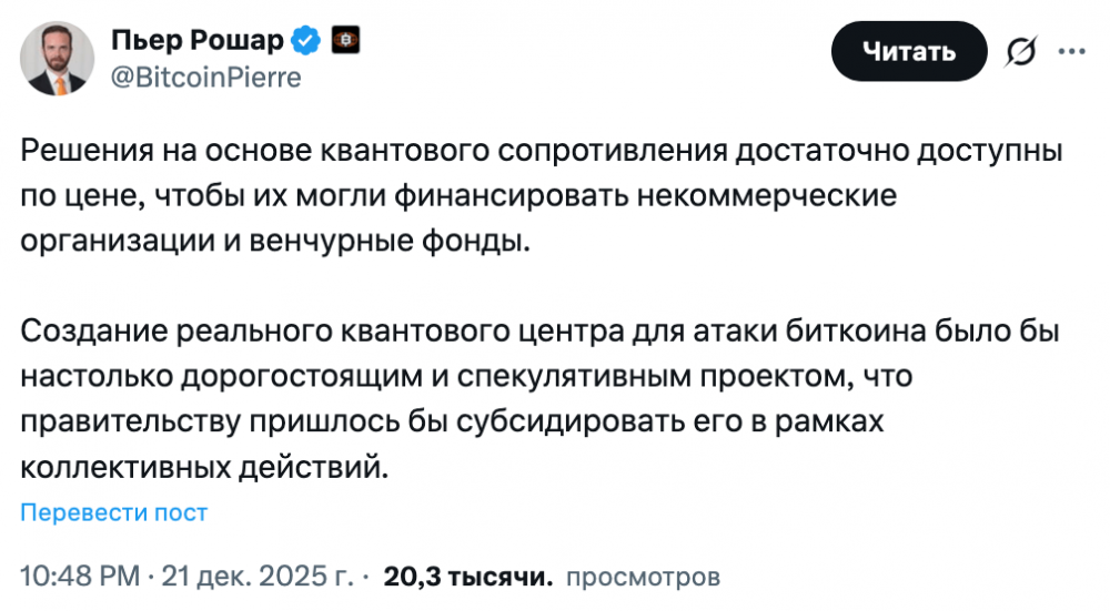 «Решения для защиты от квантовых атак достаточно доступны по стоимости — их могут профинансировать некоммерческие организации и венчурные капиталисты», — заявил максималист биткоина Пьер Рошар.