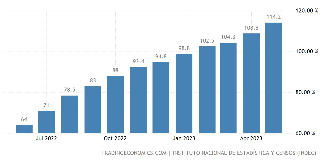 Аргентинцы обратились к биткойнам, чтобы не отставать от гиперинфляции в стране. По данным Trading Economics, годовой уровень инфляции в Аргентине вырос на 114% в мае по сравнению со скачком на 108% в апреле 2023 года, достигнув самого высокого уровня с 1991 года.