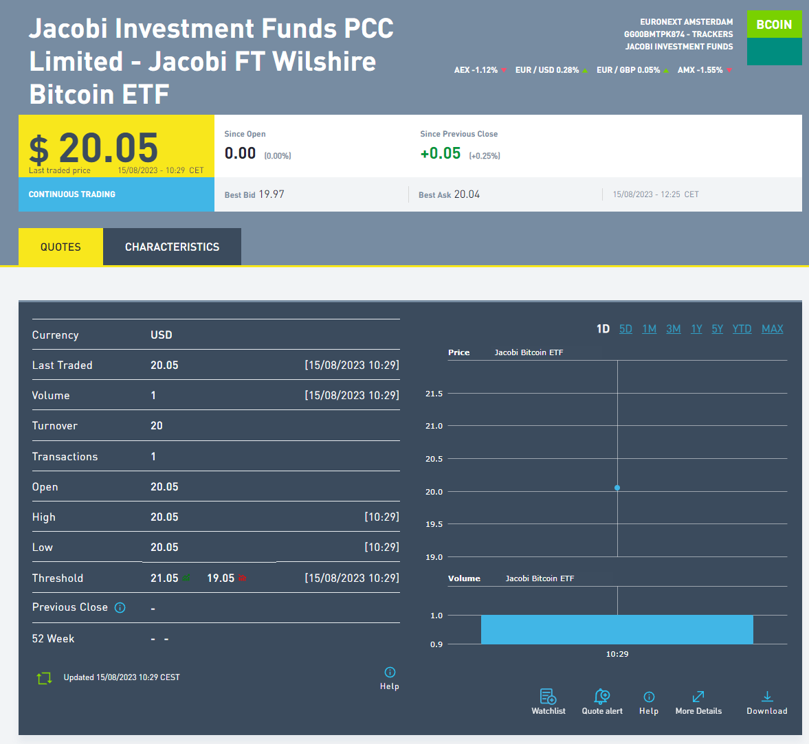 Торги по биткойн-ETF Jacobi FT Wilshire. Источник: Euronext Amsterdam.