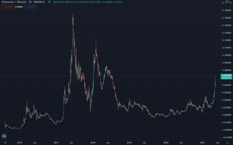 Пара ETH / BTC с начала года выросла примерно на 191%. Между тем, рыночная доля биткоина упала ниже 44% впервые с июля 2018 года. Тем не менее, ETH по-прежнему на 53% ниже своего исторического максимума, измеренного в биткоине, который был зафиксирован еще в июне 2017 года.