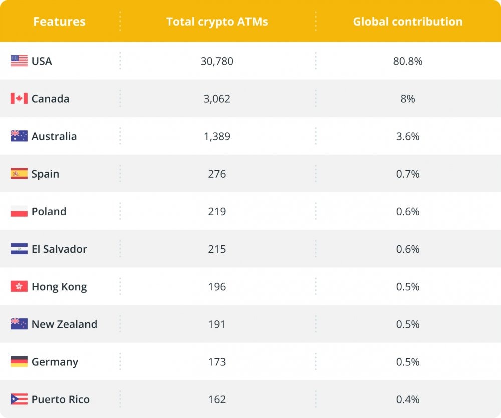 В настоящее время в мире действуют около 38 100 криптобанкоматов, расположенных в 65 странах и обслуживаемых 356 операторами.