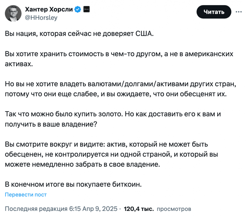 «Вы хотите хранить стоимость в чем-то, кроме активов США. Но вы не хотите владеть валютами/долгами/активами других стран, потому что они еще слабее, и вы ожидаете, что они обесценят их», — сказал Хантер Хорсли, генеральный директор компании по управлению криптоактивами Bitwise, в сообщении от 9 апреля на X.