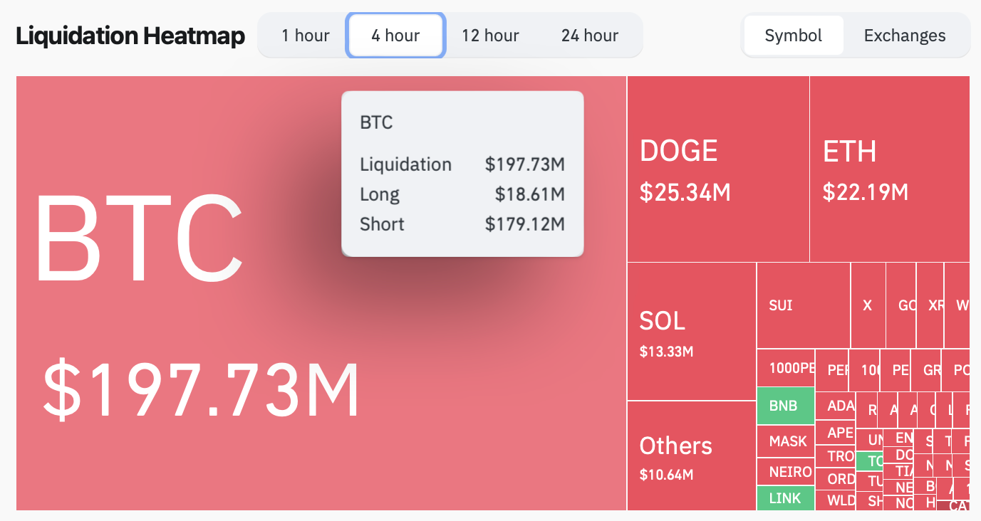 В общей сложности $197,73 млн коротких и длинных позиций были ликвидированы за 4-часовой период после того, как Bitcoin пересек уровень $70 000. Источник: CoinGlass