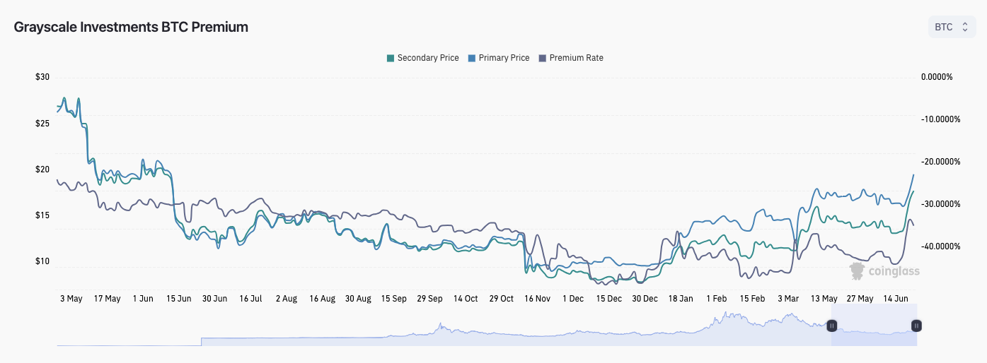 Премия/дисконт GBTC по сравнению с первичной и вторичной ценой BTC/USD (скриншот). Источник: CoinGlass
