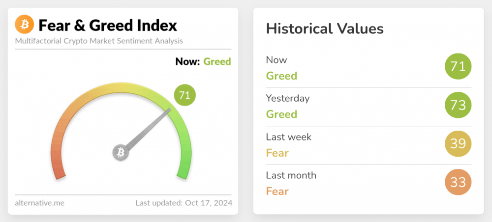 Индекс страха и жадности рынка, отслеживающий настроения, также продемонстрировал некоторую положительную динамику: в последнем обновлении от 16 октября он набрал 73 балла из 100, что вполне соответствует уровню «жадности», который он удерживал последние три дня.