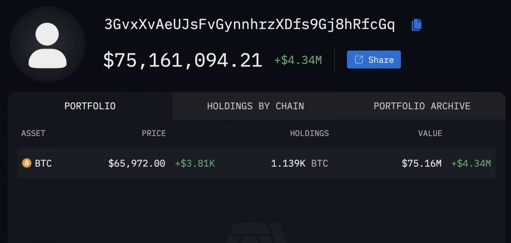 Он добавил, что, несмотря на недавние перемещения, в кошельке кита по-прежнему хранятся биткоины на сумму $75,2 млн.