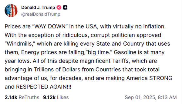 По данным GoldPrice, в понедельник цена на золото достигла исторического максимума, составив 3485 долларов за унцию после скачка на 1%. Это произошло после того, как в воскресенье Трамп опубликовал в своей социальной сети Truth Social пост, в котором заявил: "Цены в США «НАМНОГО НИЖЕ», при этом инфляции практически нет. За исключением нелепых, одобренных коррумпированными политиками «ветряных мельниц», которые убивают все штаты и страны, где они используются, цены на энергоносители падают, причем значительно. Бензин находится на многолетних минимумах. И всё это несмотря на огромные пошлины, которые приносят триллионы долларов странам, десятилетиями наживавшимся на нас, и делают Америку СИЛЬНОЙ и УВАЖАЕМОЙ!!!