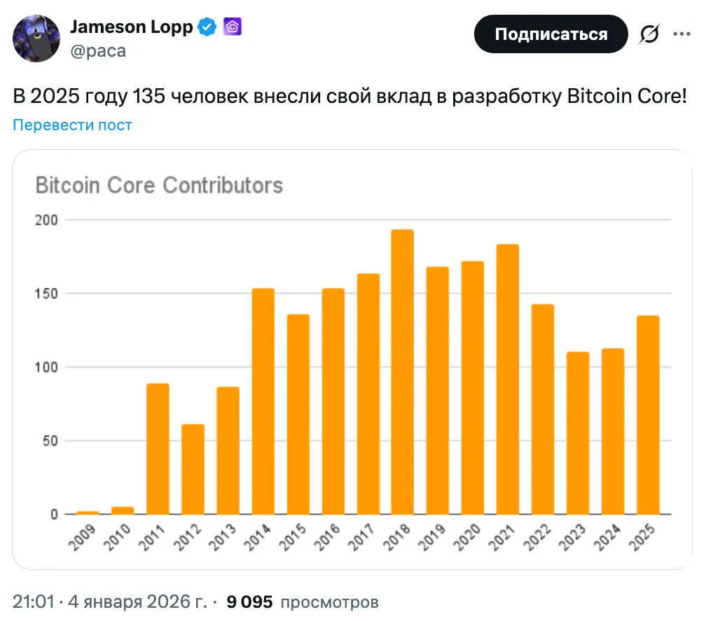Лопп сообщил в воскресенье, что в прошлом году код в Bitcoin Core внесли 135 разных человек. Это больше, чем в 2024 году, когда число участников превысило 100. Рост продолжается, хотя пик был достигнут в 2018 году — тогда вклад внесли почти 200 разработчиков.
