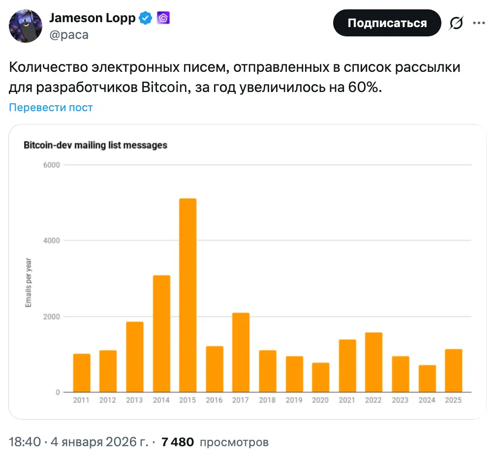 Объем переписки в списке рассылки для разработчиков Bitcoin (Bitcoin Development Mailing List) — ключевой площадке для обсуждения изменений в сети — в 2025 году вырос на 60% по сравнению с предыдущим годом.