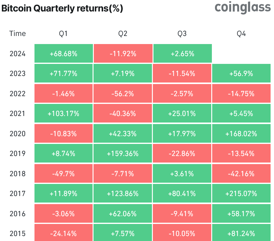Поквартальная доходность Биткоина с 2015 года. Источник: Coinglass.
