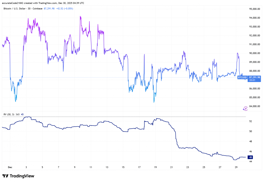 За последний месяц годовая 30‑дневная реализованная волатильность биткоина устойчиво снизилась до уровня середины 40‑х процентов. Это отражает рынок, который остается в диапазоне и лишен уверенных настроений. По данным TradingView, при уровне в 45% 30‑дневная реализованная волатильность заметно ниже среднего показателя за 365 дней (48%).
