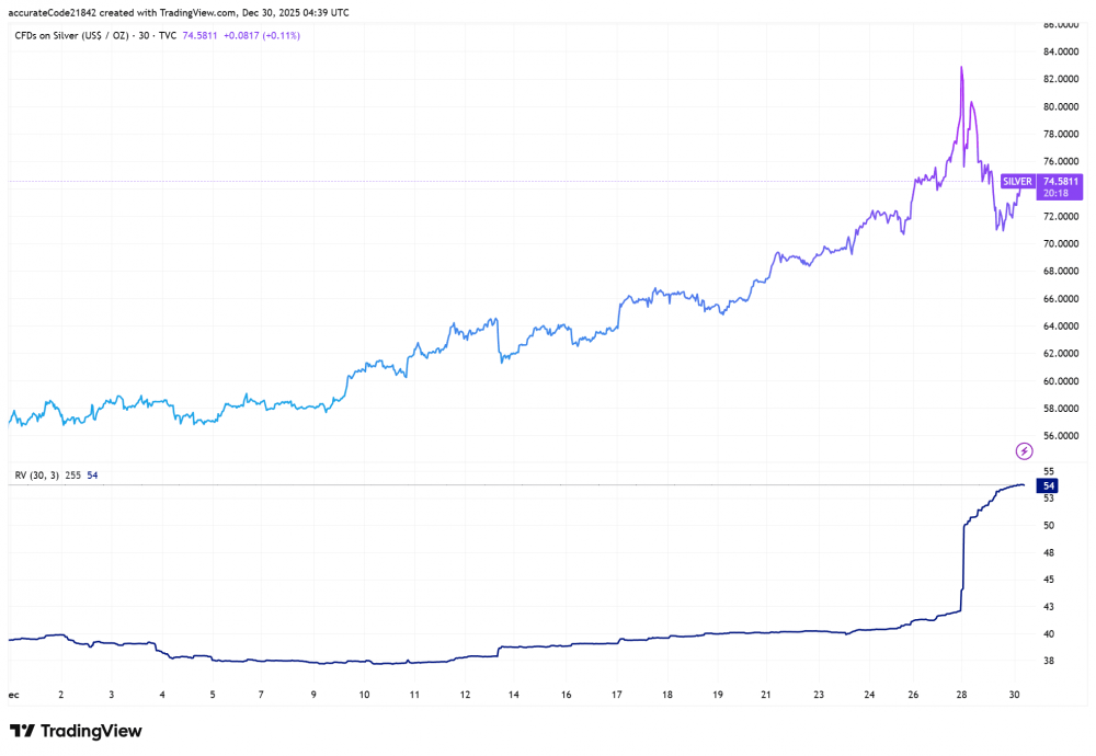 Реализованная волатильность серебра выросла до середины 50‑х процентов. Причиной стали резкий рост цен, увеличение физической премии и напряженность на мировых рынках слитков. Реализованная (историческая) волатильность отражает реальные колебания цены актива за определенный период.