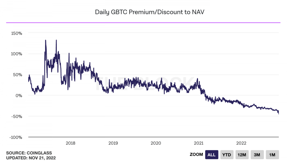 Grayscale Bitcoin Trust (GBTC) — продукт, который предлагает доступ к биткойнам через структуру фонда — торговался на самом низком уровне относительно стоимости чистых активов, согласно данным Coinglass, которые показывают, что GBTC торговался с дисконтом 45,2% к NAV.