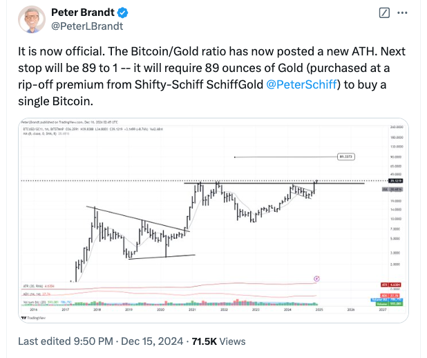 Опытный фьючерсный трейдер форекс Питер Брандт 16 декабря сообщил на X, что соотношение биткоина (BTC) к золоту достигло нового ATH.