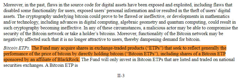 «Фонд может приобретать акции биржевых продуктов («ETP»), которые призваны в целом отражать динамику цены Биткоина, путем непосредственного владения биткоинами («ETP Биткоина»), включая акции ETP Биткоина, спонсируемых аффилированным лицом BlackRock», – говорится в поправке.