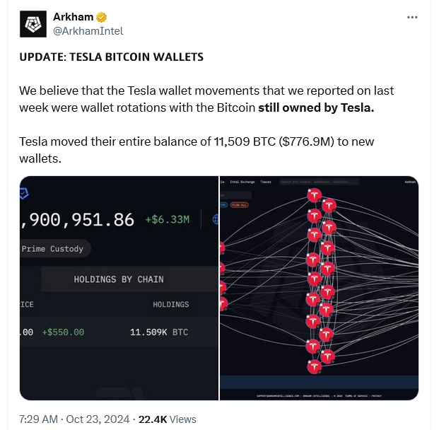 «Мы считаем, что перемещения кошельков Tesla, о которых мы сообщили на прошлой неделе, были ротациями кошельков, при этом биткоины все еще принадлежали Tesla», — заявила Arkham Intelligence в сообщении X от 22 октября.