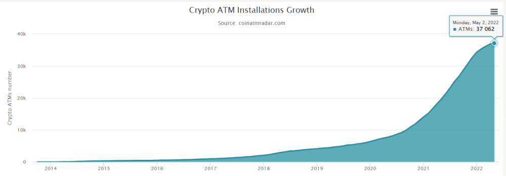 Согласно данным, предоставленным Coin ATM Radar, в 2021 году наблюдался самый высокий глобальный рост количества установок банкоматов BTC, а в августе наблюдался пик чистого изменения в 2037 банкоматов. Начиная с января 2022 года, количество крипто-банкоматов упало до 1687 по сравнению с декабрьским максимумом в 1969 банкоматов.