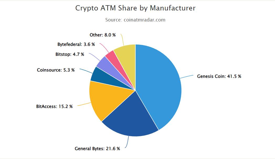 Genesis Coin сохраняет свое давнее доминирование на рынке криптовалютных банкоматов, занимая 41,5% рынка. Другими известными производителями криптовалютных банкоматов являются General Bytes (21,6%), BitAccess (15,2%) и Coinsource (5,3%).