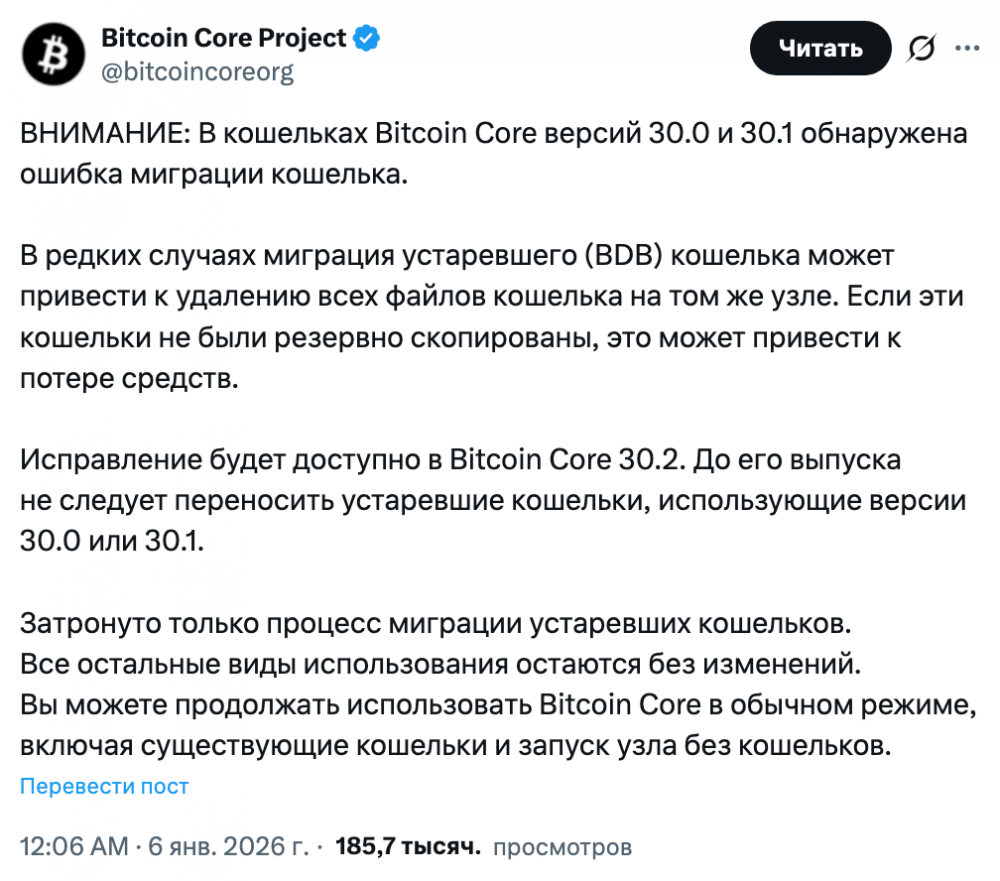 Версия Bitcoin Core 30.1 была выпущена 1 января, а об ошибке в механизме миграции кошельков публично сообщили в понедельник. Разработчики удалили сборки 30.0 и 30.1 с официального сайта загрузки.