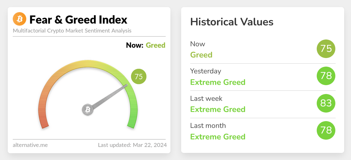 Он упал на 15 пунктов с 5 марта, когда он достиг показателя 90/100 или «чрезвычайной жадности» — самого высокого показателя с 20 февраля 2021 года.
