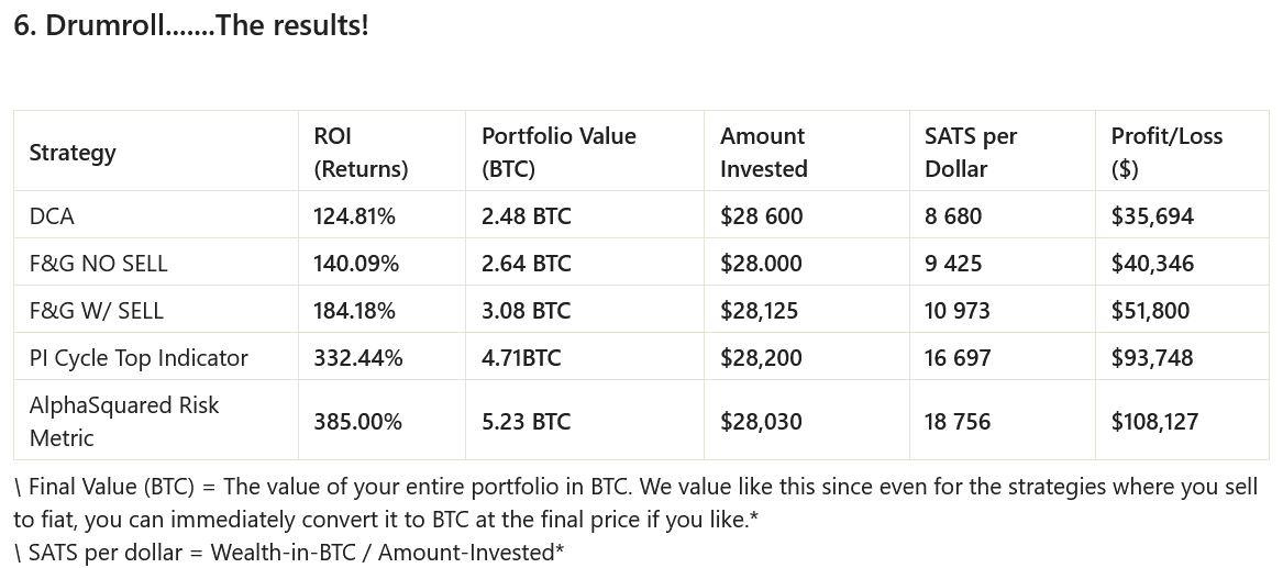 u/skogsraw также использовал две другие стратегии — «Модель риска AlphaSquared DCA» и «Верхний индикатор цикла PI», — которые дали рентабельность инвестиций 385% и 332,4% соответственно.
