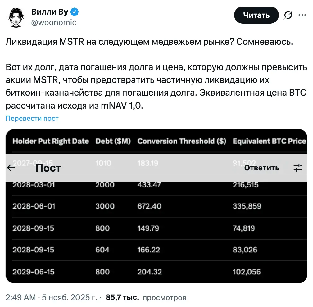 У Strategy имеется долг на сумму около $1,01 млрд со сроком погашения 15 сентября 2027 года. Чтобы избежать необходимости продавать биткоин для его погашения, курс акций компании должен оставаться выше $183,19, как отметил Ву.