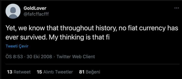 Аккаунт открыт в мае 2008 года. Кто бы ни открывал аккаунт, он автоматически извлекал сообщения, содержащие слово «золото», и делился ими в виде твитов. Таким образом, если вы просмотрите этот профиль, вы можете увидеть много разных заголовков новостей и статей, содержащих слово «золото».  Там можно найти сообщения о фиатных валютах, экономическом кризисе и политике ФРС.
