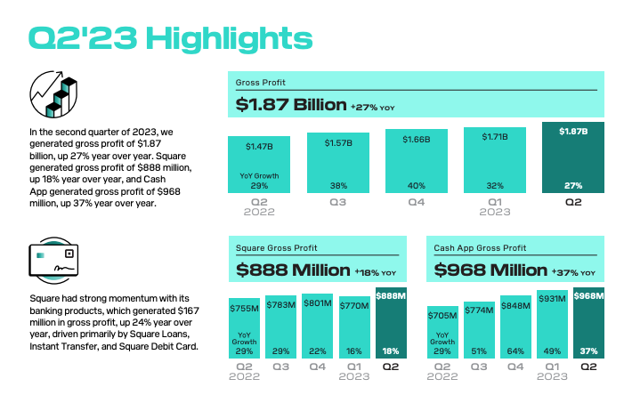 В целом Block Inc. сообщила о валовой прибыли в размере 1,87 млрд долларов США, что на 27% больше по сравнению с прошлым годом, в то время как Cash App продолжает демонстрировать силу с валовой прибылью в размере 968 млн долларов США, что на 37% больше, чем в прошлом году.