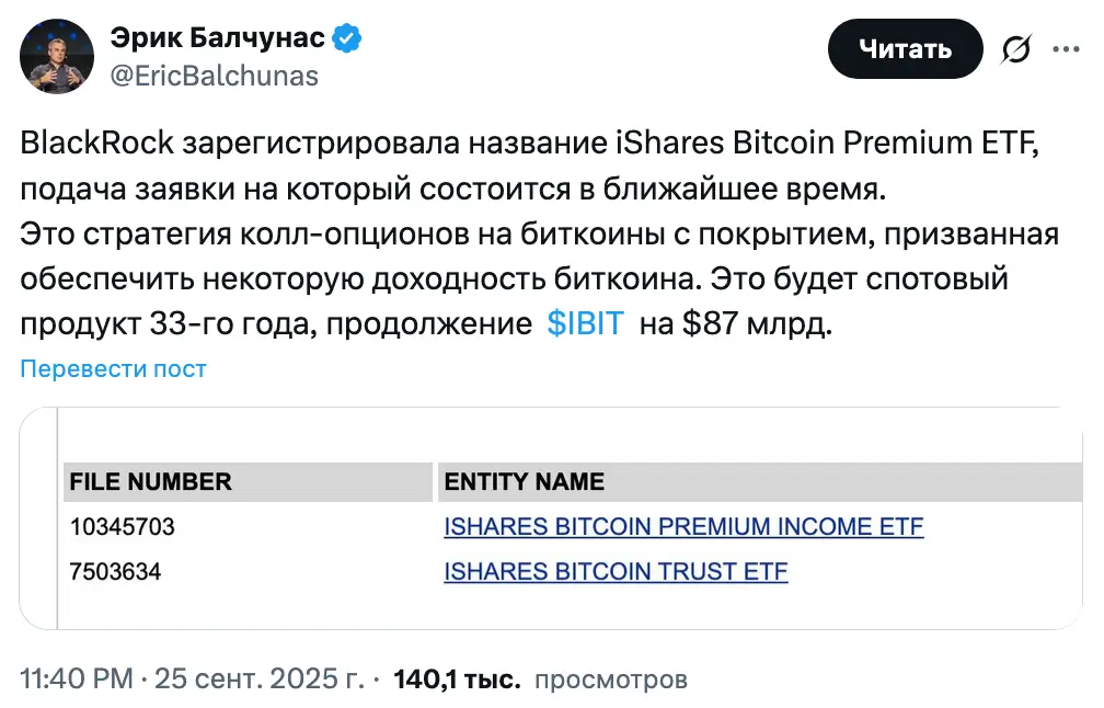 25 сентября крупнейшая в мире компания по управлению активами BlackRock подала заявку на регистрацию трастовой компании в Делавэре для создания ETF Bitcoin Premium Income. Аналитик Bloomberg ETF Эрик Балчунас заявил, что предлагаемый фонд будет генерировать доходность за счет выпуска покрытых опционов колл на фьючерсы биткоина и сбора опционных премий.