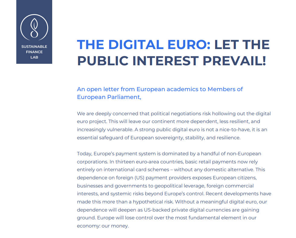 В открытом письме, опубликованном в воскресенье и озаглавленном «Цифровой евро: пусть приоритет будет у общественных интересов!», содержится предупреждение: без сильного публичного аналога частные стейблкоины и иностранные платежные гиганты могут получить еще большее влияние на цифровые платежи в Европе.