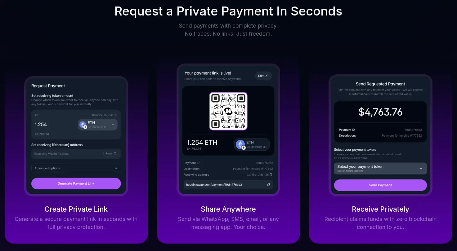 Houdini Pay позволяет создавать общедоступные платёжные ссылки с поддержкой более 4 тыс. цифровых активов в различных блокчейнах. Система конвертирует актив в предпочитаемый получателем и маршрутизирует платёж таким образом, что разрывает прямую блокчейн‑связь между отправителем и получателем. Это препятствует отслеживанию кошельков друг друга.